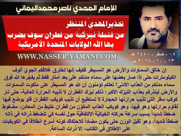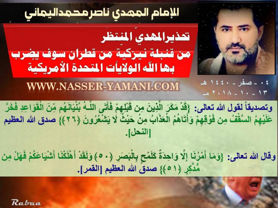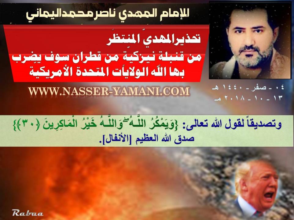 مشاء الله نور على نور يهدي الله بنوره من يشاء مشاءالله تبارك الله على أمامنا المهدي المنتظر ناصرمحمداليماني خليفة الله في الأرض واضح وضوح الشمس من خلال النور الذي يشع من صورتة بأنه صاحب القول السديد والمخلص الموعودبعدخاتم إلانبياء والمرسلين في زمن الفتن الطائفية والمذهبيه والعنصريه الباطله التي ليس لها علاقة بدين الإسلام عصرالفجوروالغرور والتكبروالتجبروسفك الدماء المحرمه بدون حق وبسم الدين ولاكن نقول نحمدالله الذي أظهرك لنايامامنا وحبيبنا وقائدنا لتعلمنا بطريق الصواب وانت أمل الامه المستضعفين بعدالله سبحانه وتعالى وانامعك من جندك بمشيئة الله تعالى ولك مني سلام الله يوصلك أين ماكنت