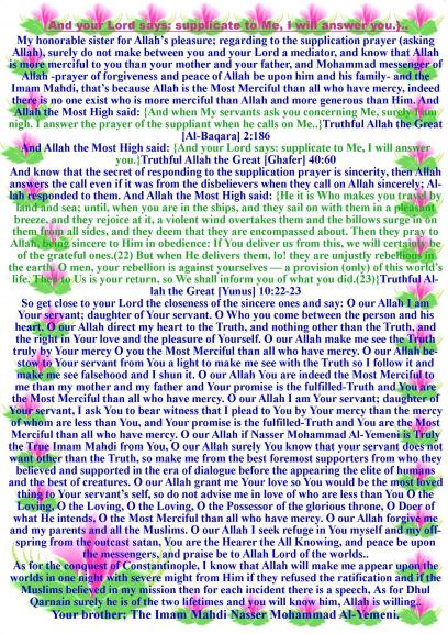 So get close to your Lord the closeness of the sincere ones and say: O our Allah I am Your servant; daughter of Your servant. O Who you come between the person and his heart. O our Allah direct my heart to the Truth, and nothing other than the Truth, and the right in Your love and the pleasure of Yourself. O our Allah make me see the Truth truly by Your mercy O you the Most Merciful than all who have mercy. O our Allah bestow to Your servant from You a light to make me see with the Truth so I follow it and make me see falsehood and I shun it. O our Allah You are indeed the Most Merciful to me than my mother and my father and Your promise is the fulfilled-Truth and You are the Most Merciful than all who have mercy. O our Allah I am Your servant; daughter of Your servant, I ask You to bear witness that I plead to You by Your mercy than the mercy of whom are less than You, and Your promise is the fulfilled-Truth and You are the Most Merciful than all who have mercy. O our Allah if Nasser Mohammad Al-Yemeni is Truly the True Imam Mahdi from You, O our Allah surely You know that your servant does not want other than the Truth, so make me from the best foremost supporters from who they believed and supported in the era of dialogue before the appearing the elite of humans and the best of creatures. O our Allah grant me Your love so You would be the most loved thing to Your servant’s self, so do not advise me in love of who are less than You O the Loving, O the Loving, O the Loving, O the Possessor of the glorious throne, O Doer of what He intends, O the Most Merciful than all who have mercy. O our Allah forgive me and my parents and all the Muslims. O our Allah I seek refuge in You myself and my offspring from the outcast satan, You are the Hearer the All Knowing, and peace be upon the messengers, and praise be to Allah Lord of the worlds..