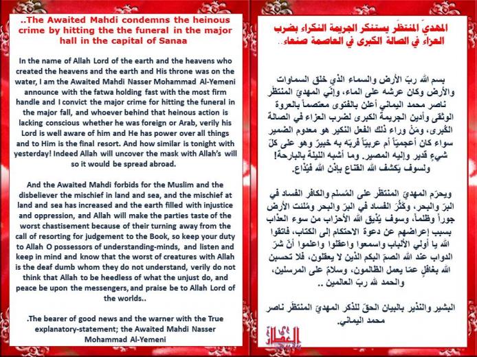 بسم الله ربّ الأرض والسماء الذي خلق السماوات والأرض وكان عرشه على الماء، وإنّي المهديّ المنتظَر ناصر محمد اليماني أعلن بالفتوى معتصماً بالعروة الوثقى وأدين الجريمة الكبرى لضرب العزاء في الصالة الكُبرى، ومَنْ وراء ذلك الفعل النكير هو معدوم الضمير سواء كان أعجميّاً أم عربيّاً فربّه به خبيرٌ وهو على كلّ شيءٍ قدير وإليه المصير. وما أشبه الليلة بالبارحة! ولسوف يَكشف الله القناع بإذن الله فيُذاع.