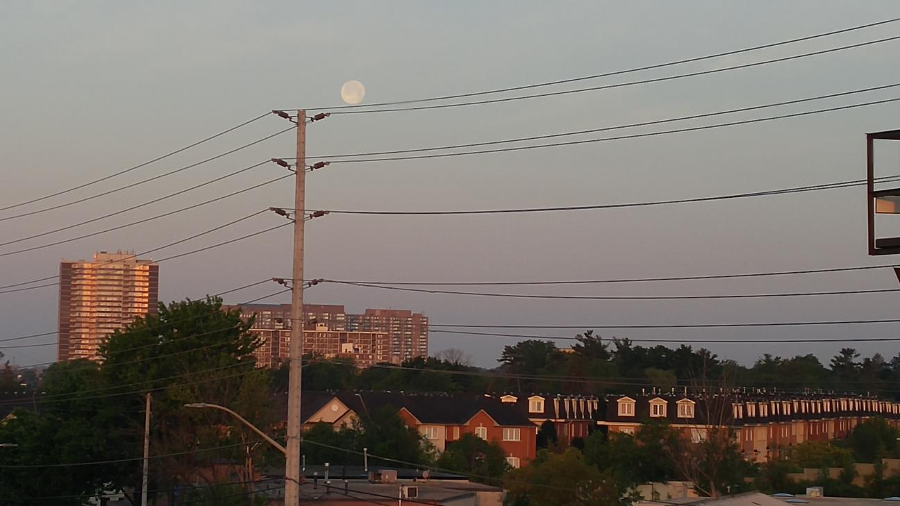 وهذه الصورة في نفس اليوم على الساعة 6 و17 دقيقة بحوالي 40 دقيقة عن شروق الشمس، نلاحظ نور القمر بدأ يختفي بسبب شعاع الشمس وهو لا يزال لم يغرب بعد: