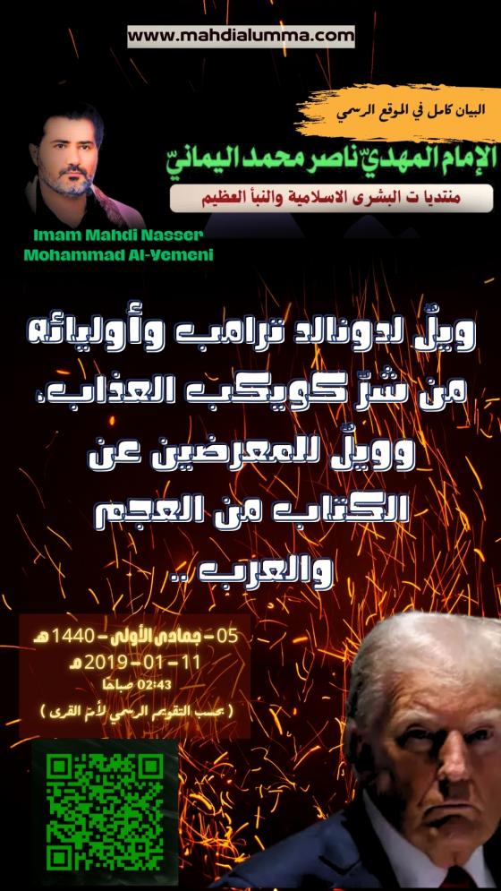 بسم الله الواحد القهار، من الإمام المهديّ ناصر محمد اليماني خليفة الله في الأرض إلى عدوّ الله دونالد ترامب ومن كان على شاكلته من شياطين البشر في الكونجرس في البيت الأسود الأمريكيّ الذين يريدون أن يُطفئوا نور الله القرآن العظيم، ويأبى الله إلا أن يتمّ نوره ولو كره المشركون من شياطين البشر ظهوره.