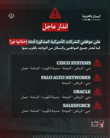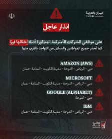 تحذير إلى النظام الأمريكي المعتدي والمهزوم؛ رداً على تصريحات الرئيس الأمريكي المعتدي والإرهابي، نعلن أنه في حال الهجوم على البنية التحتية النفطية والاقتصادية وقطاع الطاقة في الجمهورية الإسلامية الإيرانية، فإننا – كما حذرنا سابقاً – سنقوم فوراً بتدمير جميع البنى التحتية النفطية والاقتصادية وقطاع الطاقة التابعة للشركات النفطية في مختلف أنحاء المنطقة التي تمتلك أسهماً أمريكية أو تتعاون مع الولايات المتحدة، وتحويلها إلى كومة من الرماد.
