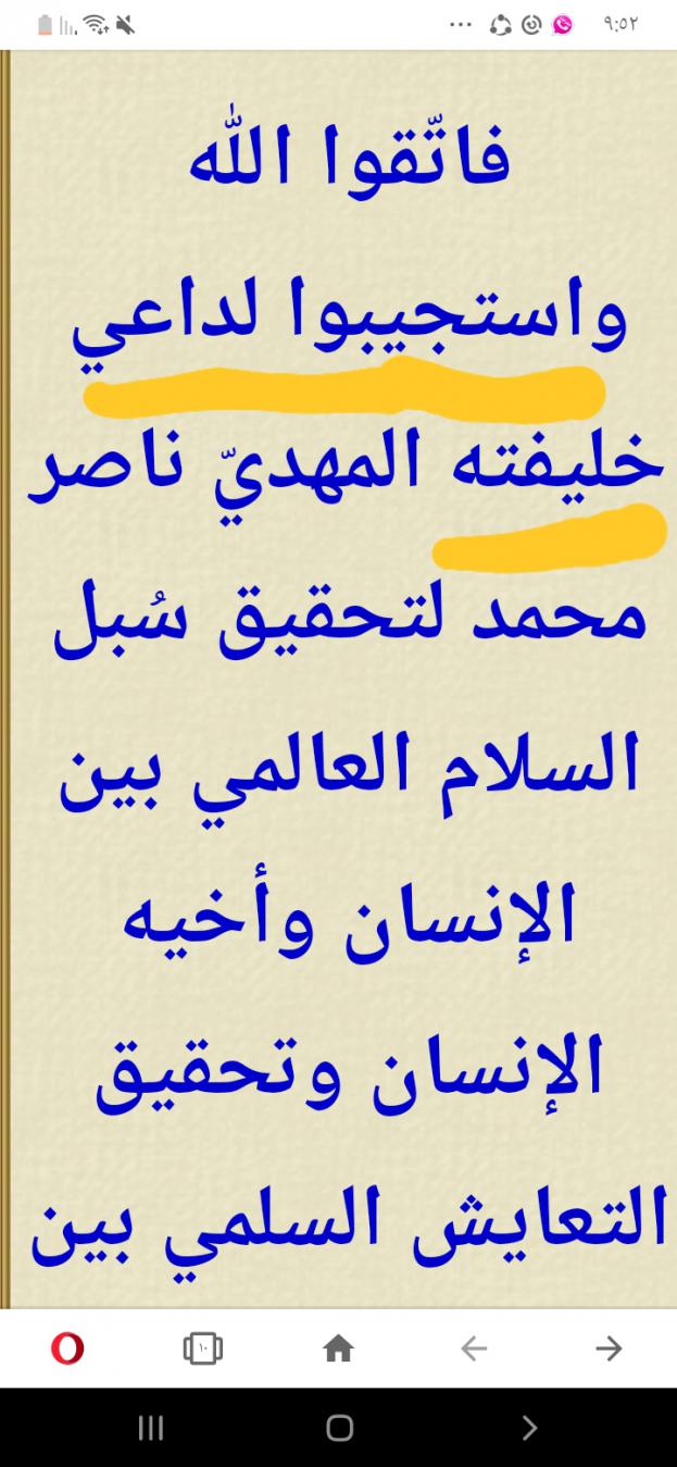 سلام من الله عليك ورحمة وبركات يا خاتم خلفاء الله أجمعين سيدى وتاج راسى الامام المهدى المنتظر ناصر محمد اليماني وسلام على معشر الأنصار الابرار والله اكبر الله اكبر ولله الحمد والعزة لله ولرسوله وللمؤمنين