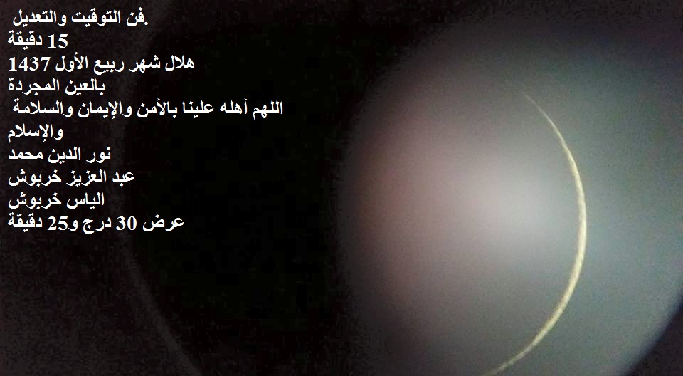وهنا شهادة نفس الشخص عن رؤيته لهلال اخر شهر صفر ب9ديسمبر . الاربعاء..........والصور اعلاه بداية الشهر. ربيع الاول1437 بعد مغيب شمس السبت 12 ديسمبر ليلة الاحد
