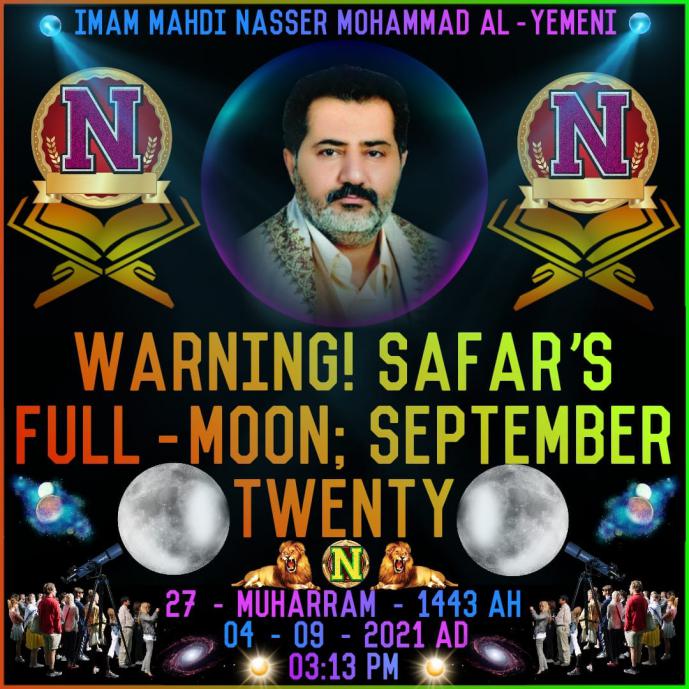 Ma io, Imam Al-Mahdi Nasir Muhammad Al-Yamani, ho annunciato a tutta l'umanità il Badr cosmico del versetto cosmico lunedì sera (20 settembre) che sorge con la luna piena e tramonta lunedì nonostante il naso di tutti gli esseri umani, a Dio piacendo , l'Uno, il Dominatore, e guardati dall'inganno di Dio! E Badr Zero tratterrà tutti i popoli umani la sera di lunedì 20 settembre 2021, e tu saprai, o tu che credi nell'inganno di Dio, non troverai per te all'infuori di Dio un custode o un soccorritore. Dio, il Mahdi, negò che il sole avesse raggiunto la luna, e lo seguì con una dolorosa punizione da parte del Signore dei mondi.