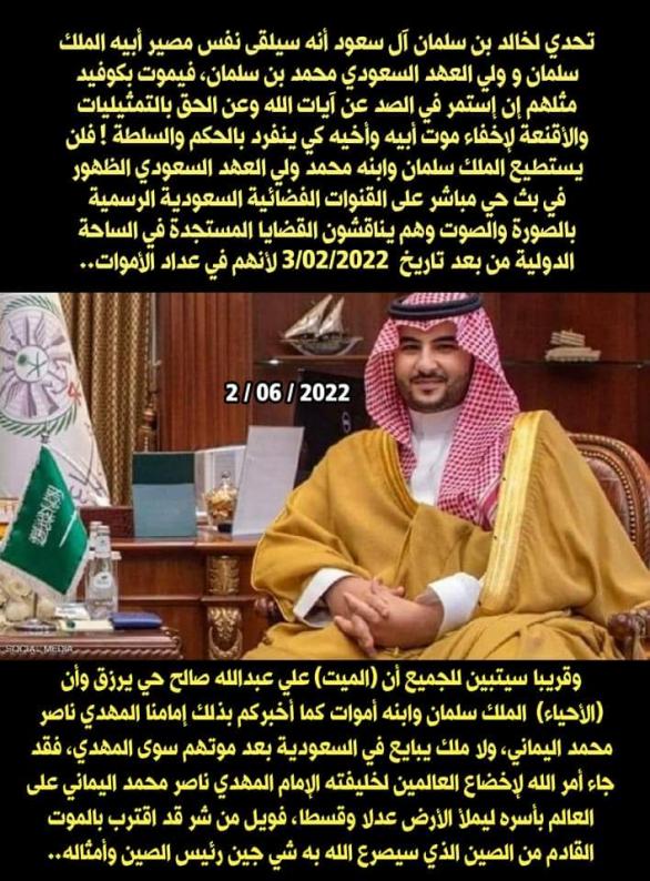 ويا معشر القادة العرب، أُشهِد الله وكفى بالله شهيدًا إن هذا هو التذكير والتحذير الأخير لكم بعد أن حَذَّرتكم ما يزيد عن سبعة عشر سنة فإمَّا أن تعتَبِروا لِما حَدَث للشاب القَويّ محمد بن سلمان، وأظن كافة زُعماء العرب أكبَر سِنًّا من محمد بن سلمان فتم صرعه في أقرَب مِن لَمح البَصَر بكوفيد كَيد مِن الله مَتيْن، فتواصلوا بخالد بن سلمان بن عبد العزيز آل سعود لئن لحقتُم به إذا لم يصرعه الله بَعْد وقولوا: "يا سمو الأمير، فهل وجدتم ناصر محمد اليماني حقًّا لَمِن الصادقين؟ فإذا كان حقًّا تَم مصرع محمد بن سلمان نظرًا للتحدّي الذي جَرى بينه وبين المهديّ ناصر محمد اليمانيّ وجاء حُكم الله وحَدَث له ما أنذرَهُ مِنه ناصر محمد اليمانيّ وحدد نوع موته (سريريّ بادئ الأمْر) فكفى بها عِظة وعِبرة لكم ولنا جميعًا صُنَّاع القرار في العالم بأسرِه كون ناصر محمد اليماني يقول أنه الإمام المهديّ جعله الله خليفه على العالم بأسرِه فهذا يعني أن الله بالغُ أمرِه فلا قِبَل للعالم بأسرِه بحرب الله فحتمًا سوف يُظهِر الله خليفته بأمرٍ مِن عنده إن الله على كل شيءٍ قَدير فأنقِذُونا وأنقِذُوا أنفسكم فلا تُخفوا علينا ما جرى بالحَقّ، وإن كان ناصر محمد اليماني مِن الكاذبين فحتمًا وليّ العهد السعوديّ محمد بن سلمان في أتمّ الصحة والعافية فَليخاطب الشعب السعوديّ كعادته بِما يشاء مِن فلسفته في مواضيعٍ جديدةٍ حدثت مِن بعد (03 - 02 - 2022 مـ) وذلك لتطمئِن قلوبنا أنه مِن الكاذبين قبل أن يقع الفأس في الرأس لنا جميعًا لو كان ناصر محمد اليماني حقًّا مِن الصادقين - خليفة الله على العالم بأسرِه - فحتمًا يُصِيبنا بما وعدنا بأنَّ الله الذي جعله خليفته على العالمين فلا نكونَنَّ أوَّل كافرٍ بدعوة خليفة الله المهدي العربي ناصر محمد اليماني كوننا عَربًا والقرآن أنزله الله بلسانٍ عربيٍّ مُبِيْن؛ نفقه ما يقول ناصر محمد اليماني، فالحُجة قائمة علينا أكبَر مِن العَجَم، فلكَم أستفزَّكم مُتَحدّيًا بِأمْر الله أن يَنطِق محمد بن سلمان (صوتًا وصورةً حيَّةً) يتكلَّم الملك سلمان وولي عهده محمد بن سلمان تكليمًا بل وأن يُنذِر بآية تعزيزٍ بثالثٍ: مصرع نائب وزير الدفاع خالد بن سلمان بكوفيد المَوت في لمح البَصَر أو هو أقرب بأمرٍ مِن عند الله حسب زعم ناصر محمد اليماني. فإذا كان صادقًا ولم تخبرونا فتلك طامّة كبرى علينا أجمعين فخليفة الرحمن ليس كخليفة المَلِك سَلمان فالأمْر خَطير وشرٌّ مُستَطير على مَن أبى واستكبَر! فهذا خليفة الله الواحد القهّار وليس خليفة بَشرٍ؛ بل الله بالغُ أمرِه ومُظهِر خليفته بحوله وقوّته، فهل على الرحمن تستكبرون يا آل سلمان بن عبد العزيز آل سعود؟ فما ظنُّكم بربّ العالمين؟"